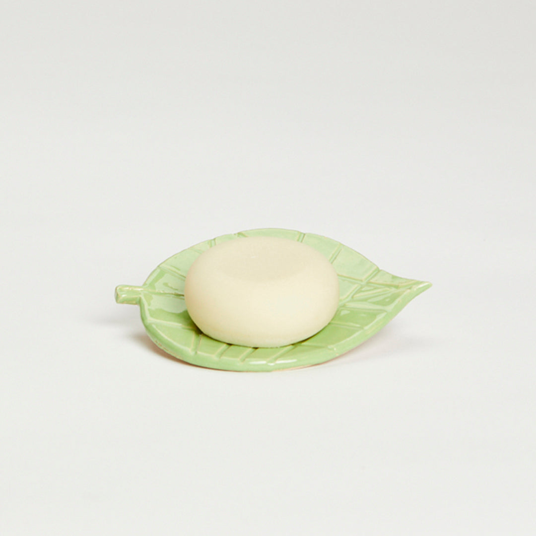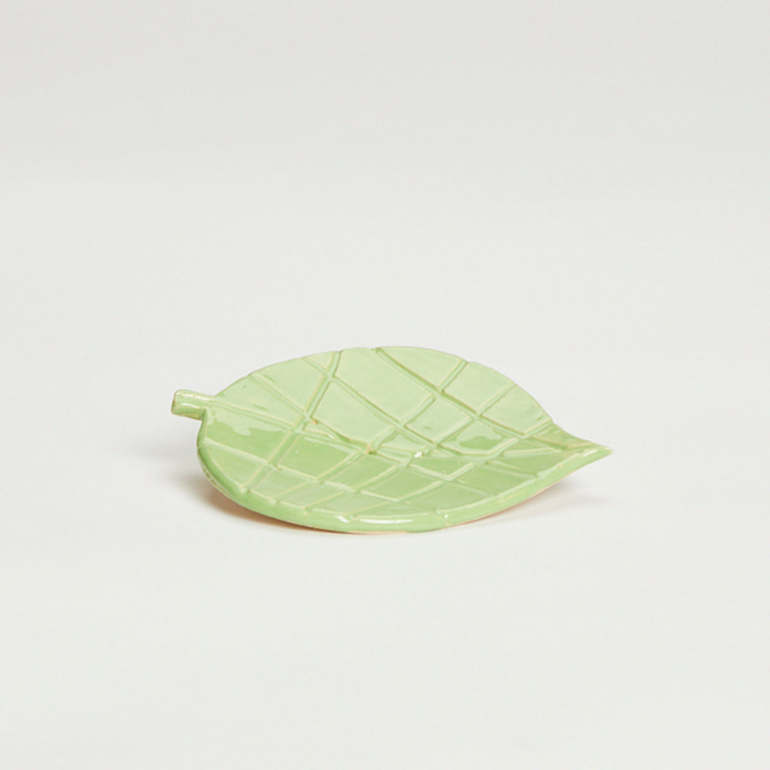 Die handgefertigte Seifenschale aus Ton ist in Form eines Birkenblatts gestaltet. Mit einem Durchmesser von etwa 13 cm und einer grünen Glasur ist sie ein dekoratives Accessoire für Ihr Badezimmer.