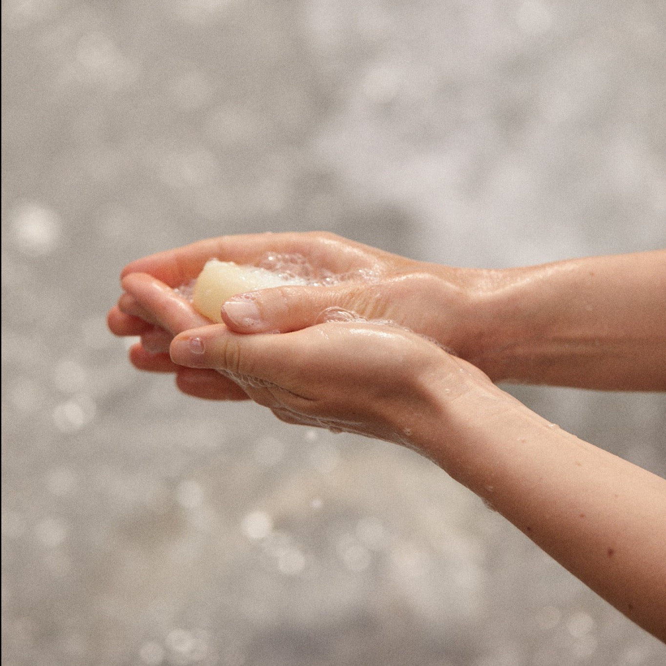 Befeuchte deine Hände gründlich unter fließendem Wasser. Nimm die feste Seife und schäume sie zwischen deinen Händen auf. Massiere den entstandenen Schaum sanft und gründlich auf deinen gesamten Handflächen ein. Nachdem du den Schaum gleichmäßig verteilt hast, spüle deine Hände gründlich unter fließendem Wasser ab, um alle Seifenreste zu entfernen.